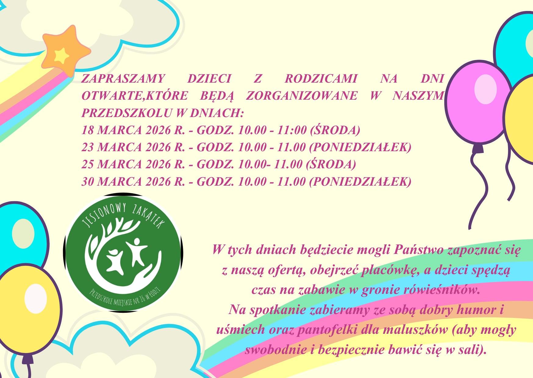 Zapraszamy dzieci z rodzicami na Dni Otwarte, które będą zorganizowane w naszym przedszkolu