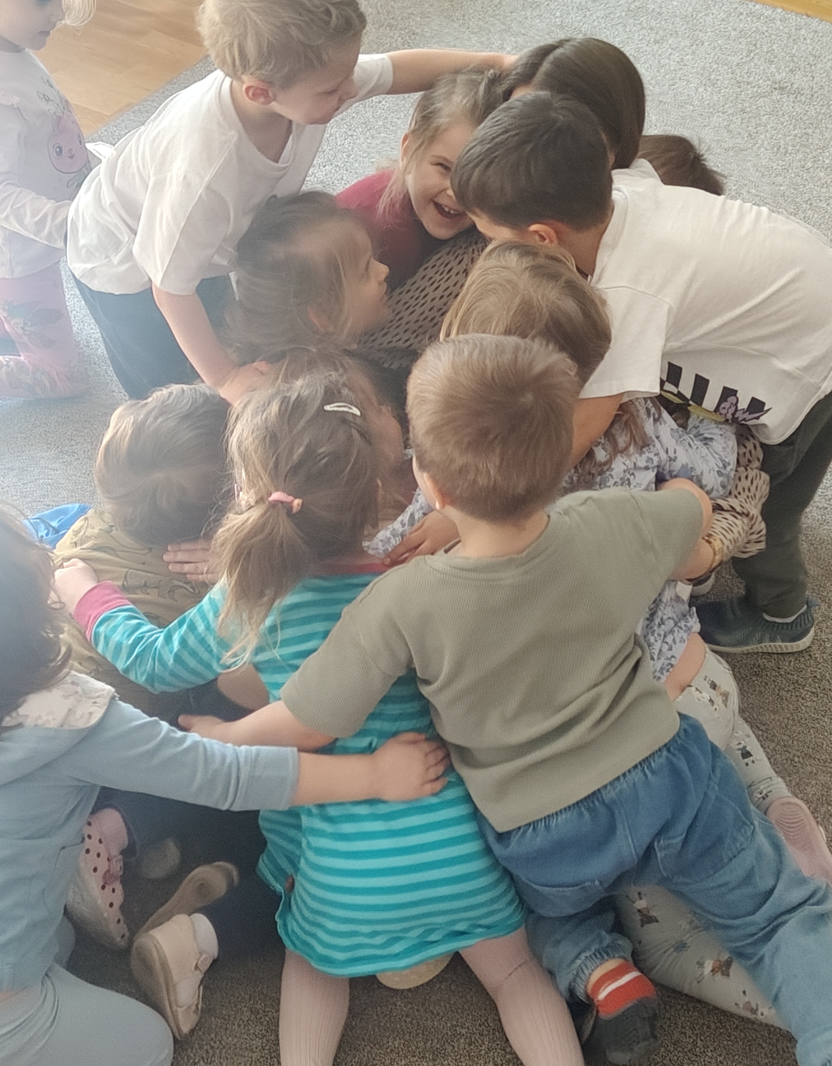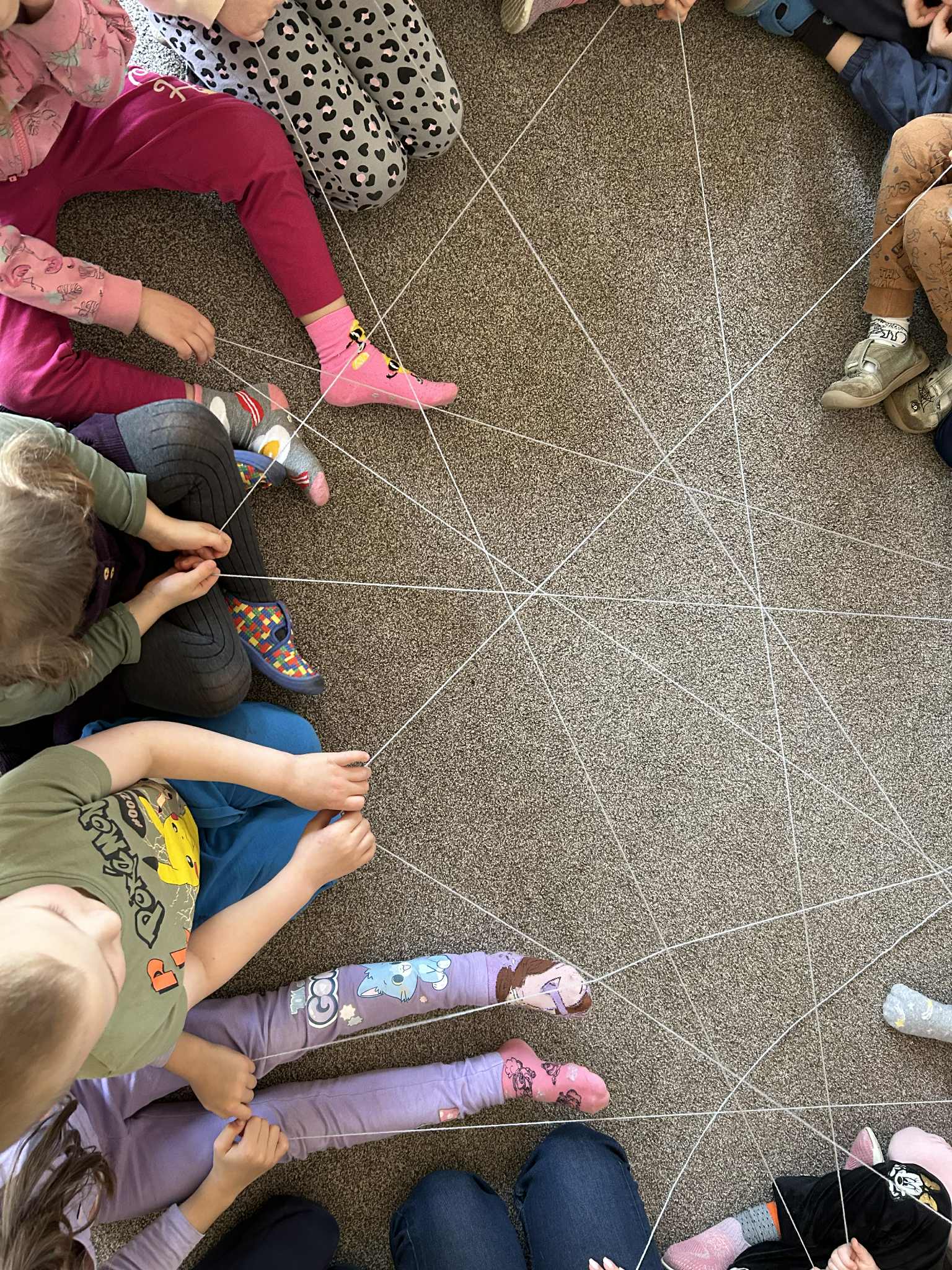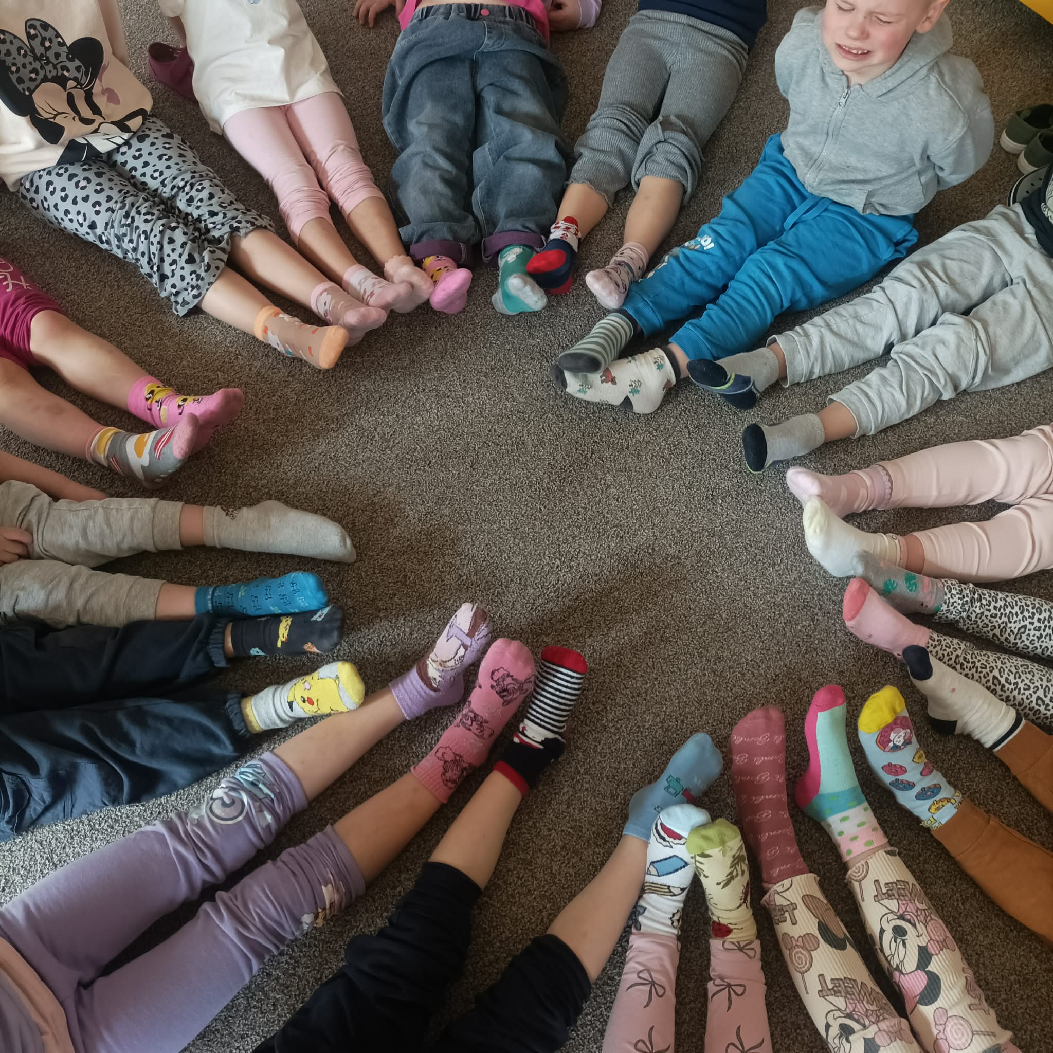 W przedszkolu odbył się Dzień Kolorowej Skarpetki – wyjątkowe wydarzenie pełne rozmów, zabawy i ważnych wartości. Dzieci wysłuchały bajkoterapii, która stała się punktem wyjścia do rozmów o tym, co sprawia, że każdy z nas jest wyjątkowy. Wspólnie odkrywały, że mimo różnic wiele nas łączy. Podczas zajęć stworzyliśmy „sieć połączeń”, ucząc się współpracy i budowania relacji oraz bycia częścią grupy. Dzieci uczyły się także wyznaczania własnych granic. W dalszej części pracowały w parach, pokonywały tor przeszkód i wspierały się nawzajem, ćwicząc uważność, zaufanie i współdziałanie.