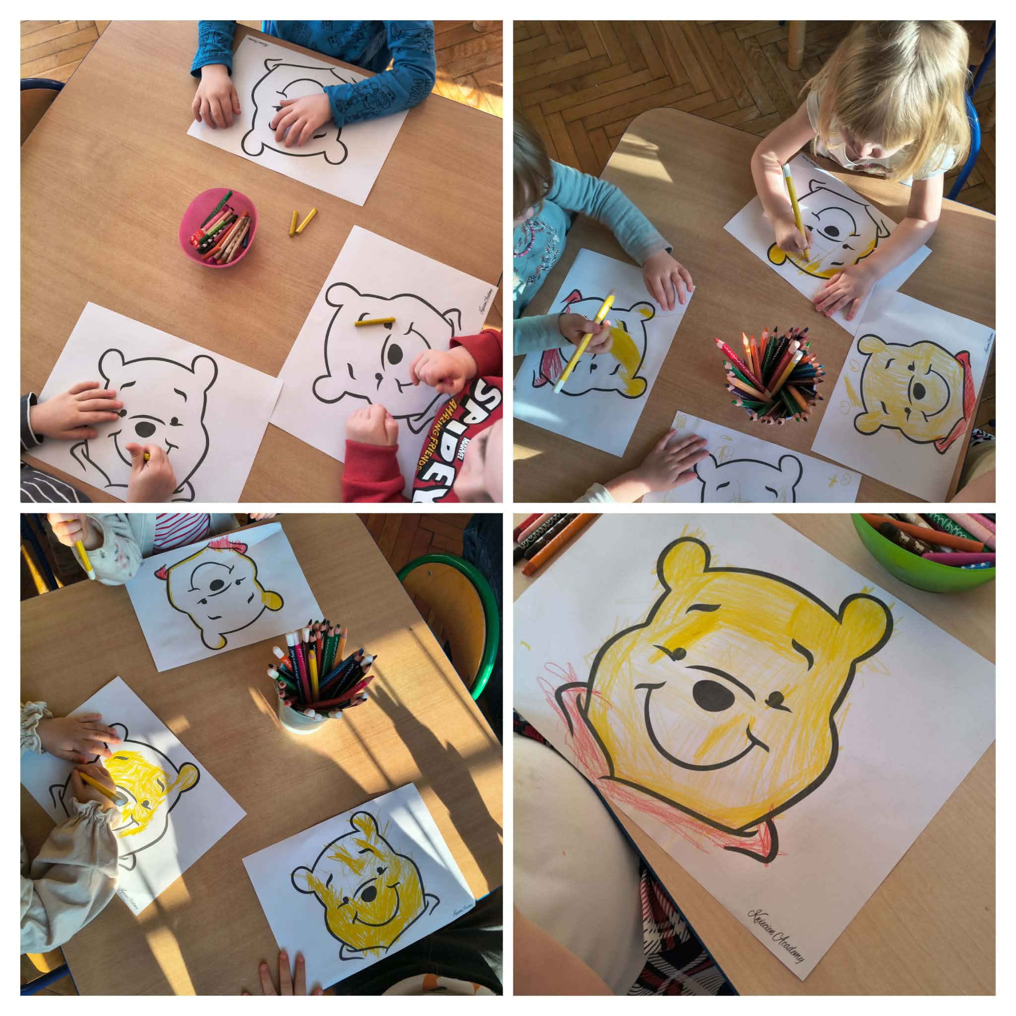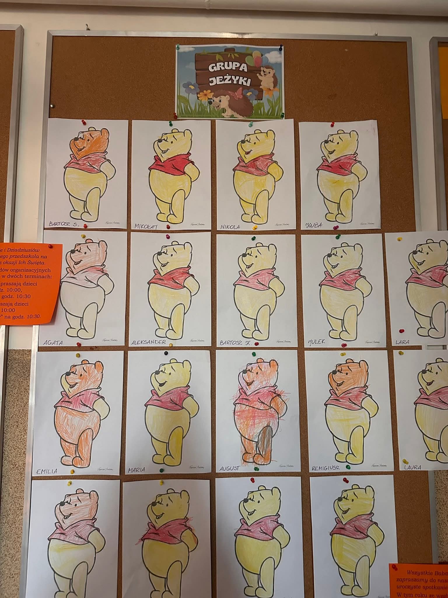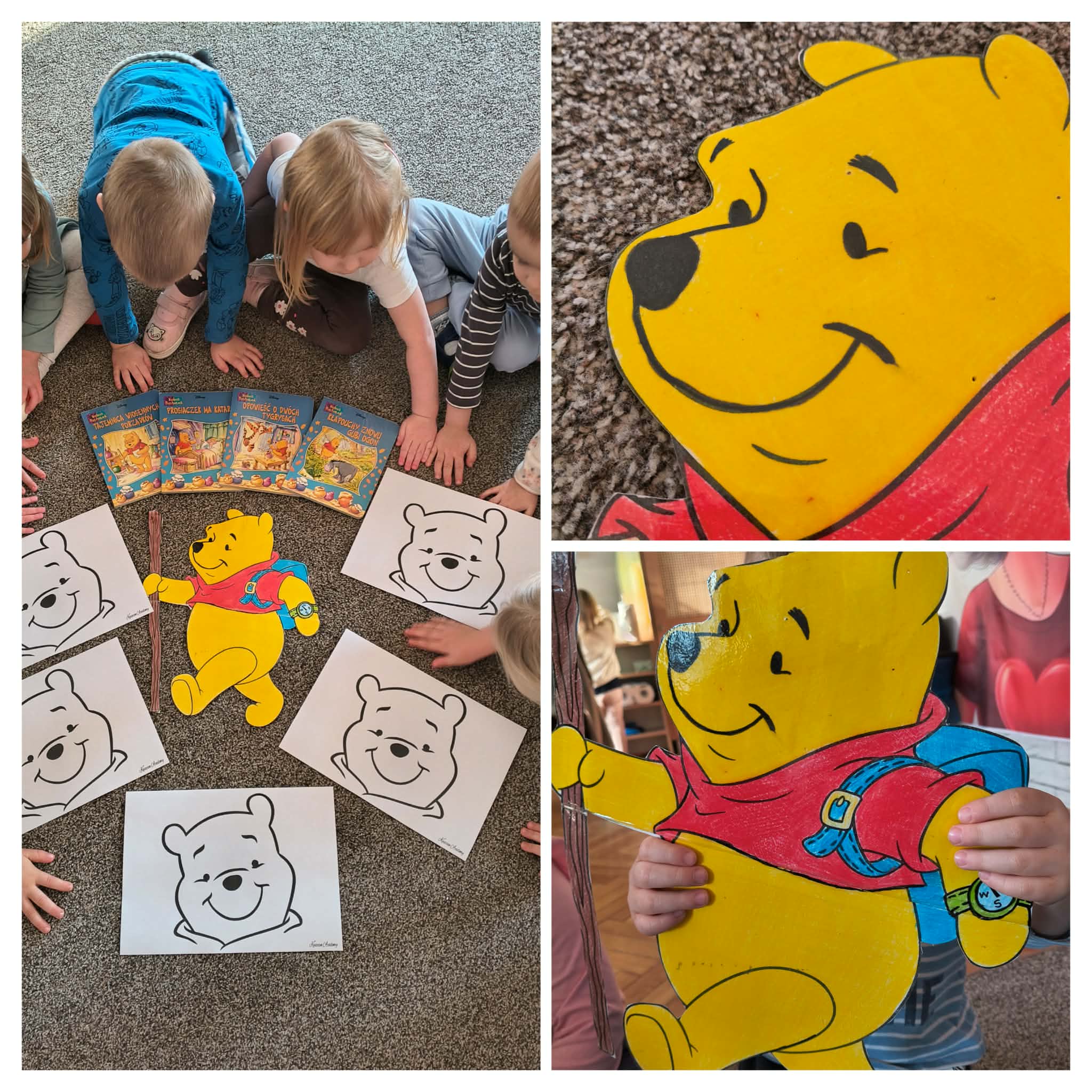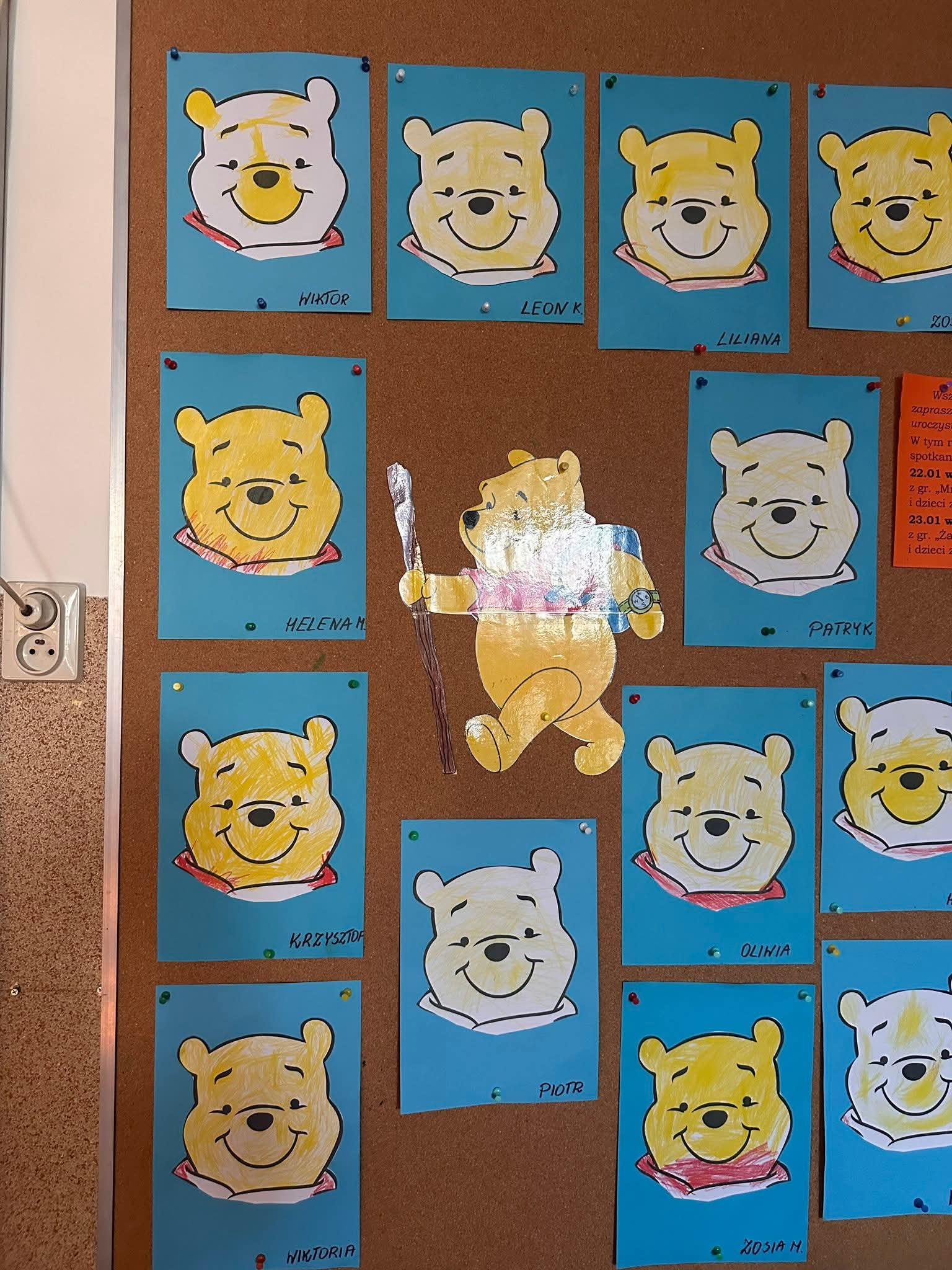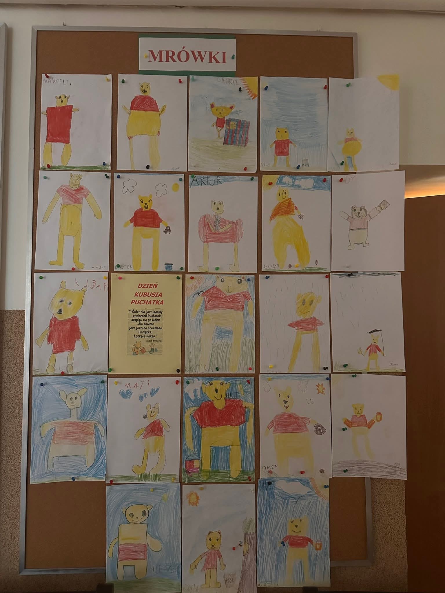 Dziś obchodziliśmy Dzień Kubusia Puchatka. Dzieci wykonywały prace plastyczne związane z bohaterem, kolorowały i tworzyły wizerunki misia. Wysłuchały także historii o Kubusiu Puchatku i jego przyjaciołach ze Stumilowego Lasu. Czas płynął w miłej, spokojnej atmosferze, pełnej usmiechu i wspólnej zabawy.