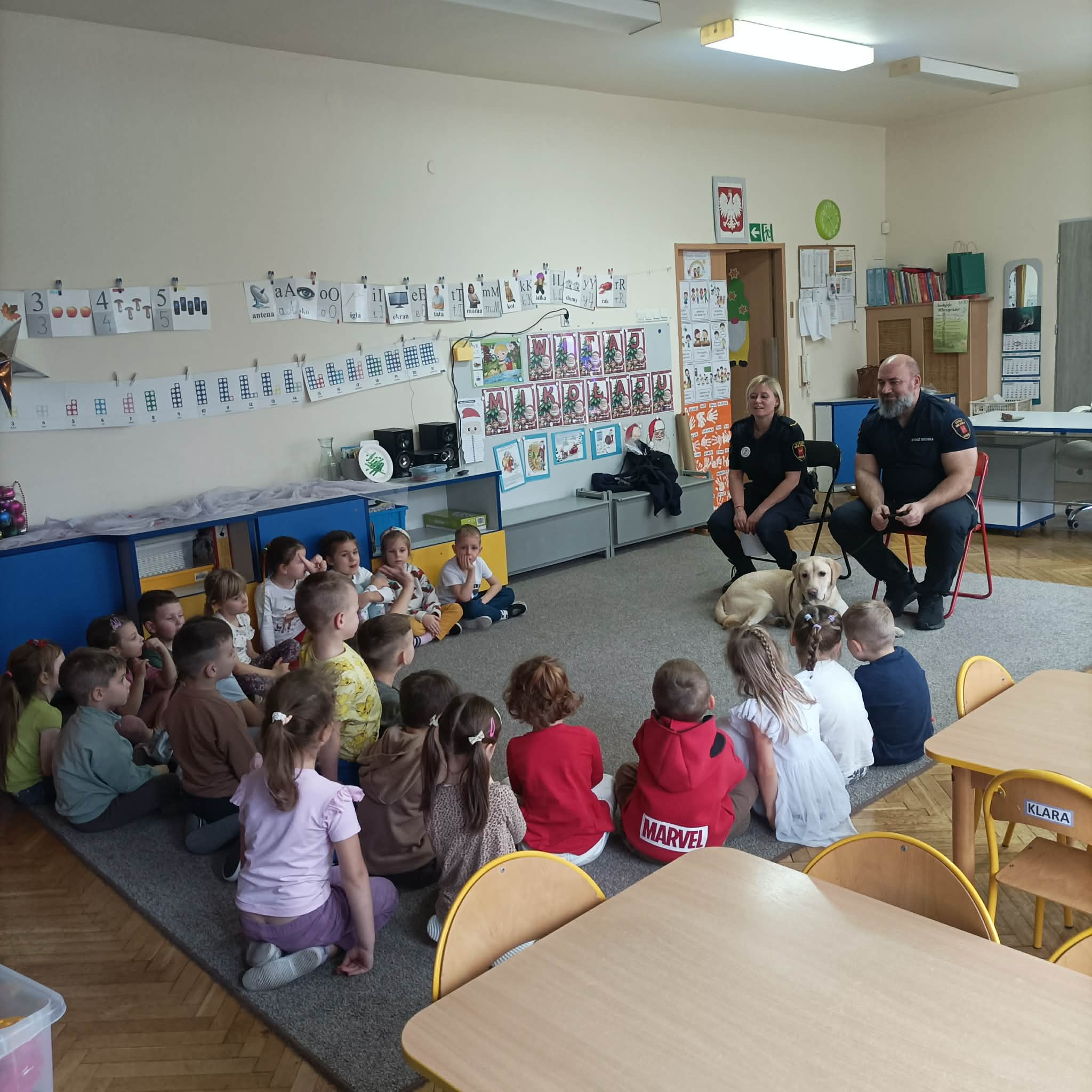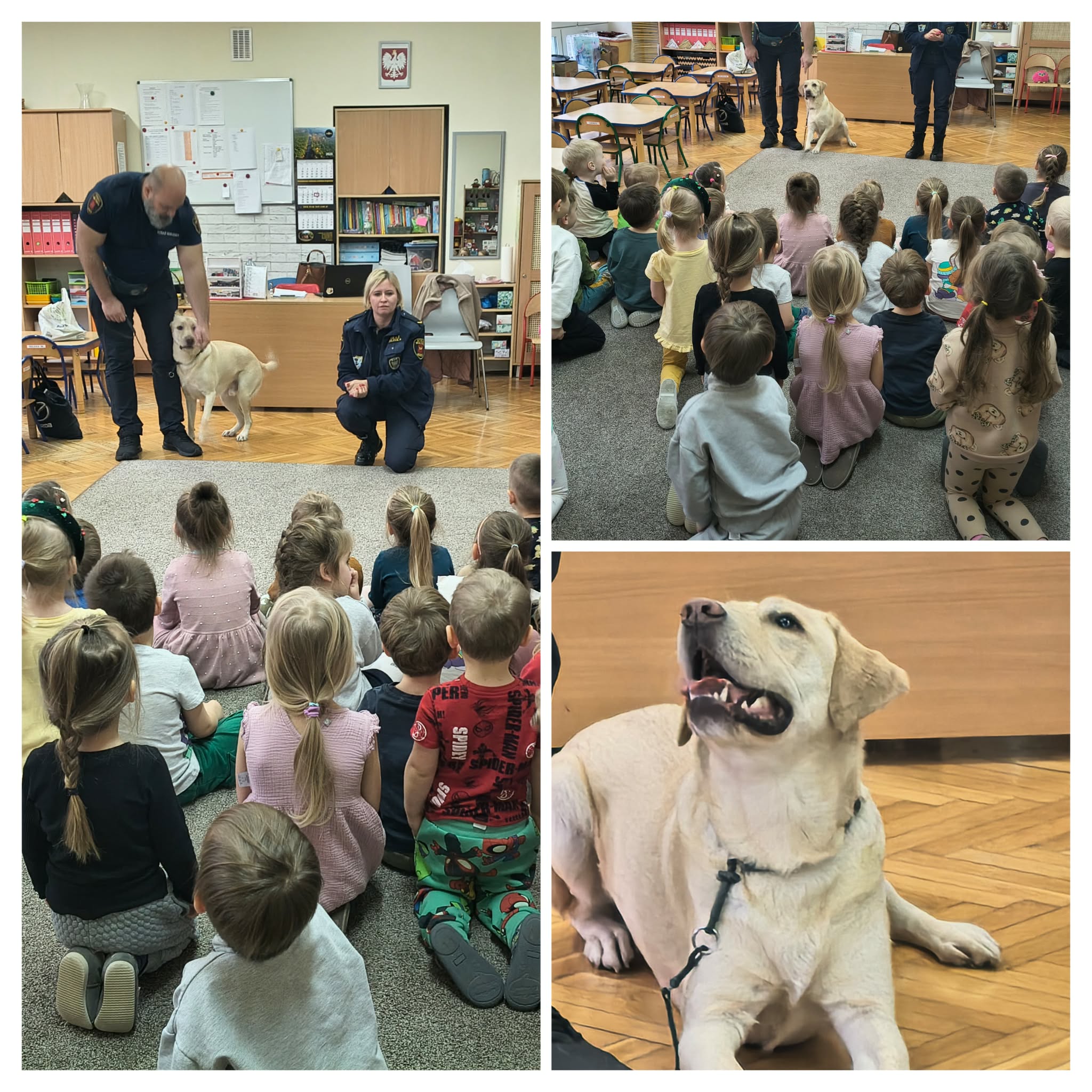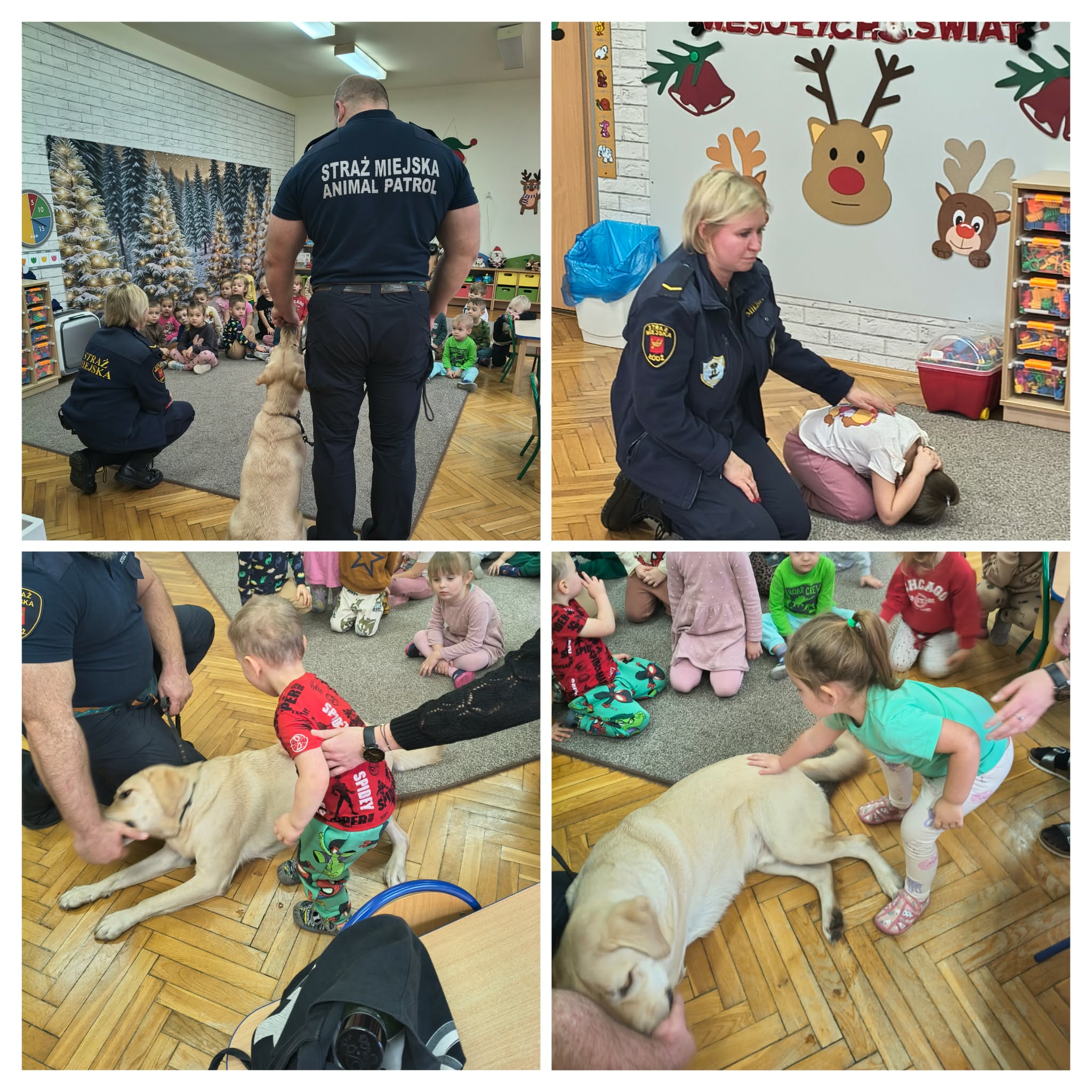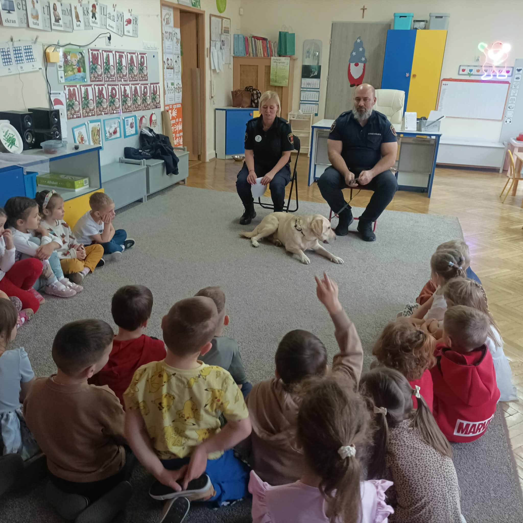 Mieliśmy dziś okazję gościć w przdszkolu przedstawicieli ze Straży Miejskiej, którzy przypominali dzieciom zasady bezpiecznego zachowania się w sytuacjach zagrożeń płynących ze świata zwierząt. Dzieci dowiedziały się, że nie wolno podchodzić do nieznajomych psów bez zgody właściciela oraz miały okazję poznać czworonożnego, niezwykle łagodnego i posłusznego pieska imieniem Maks.