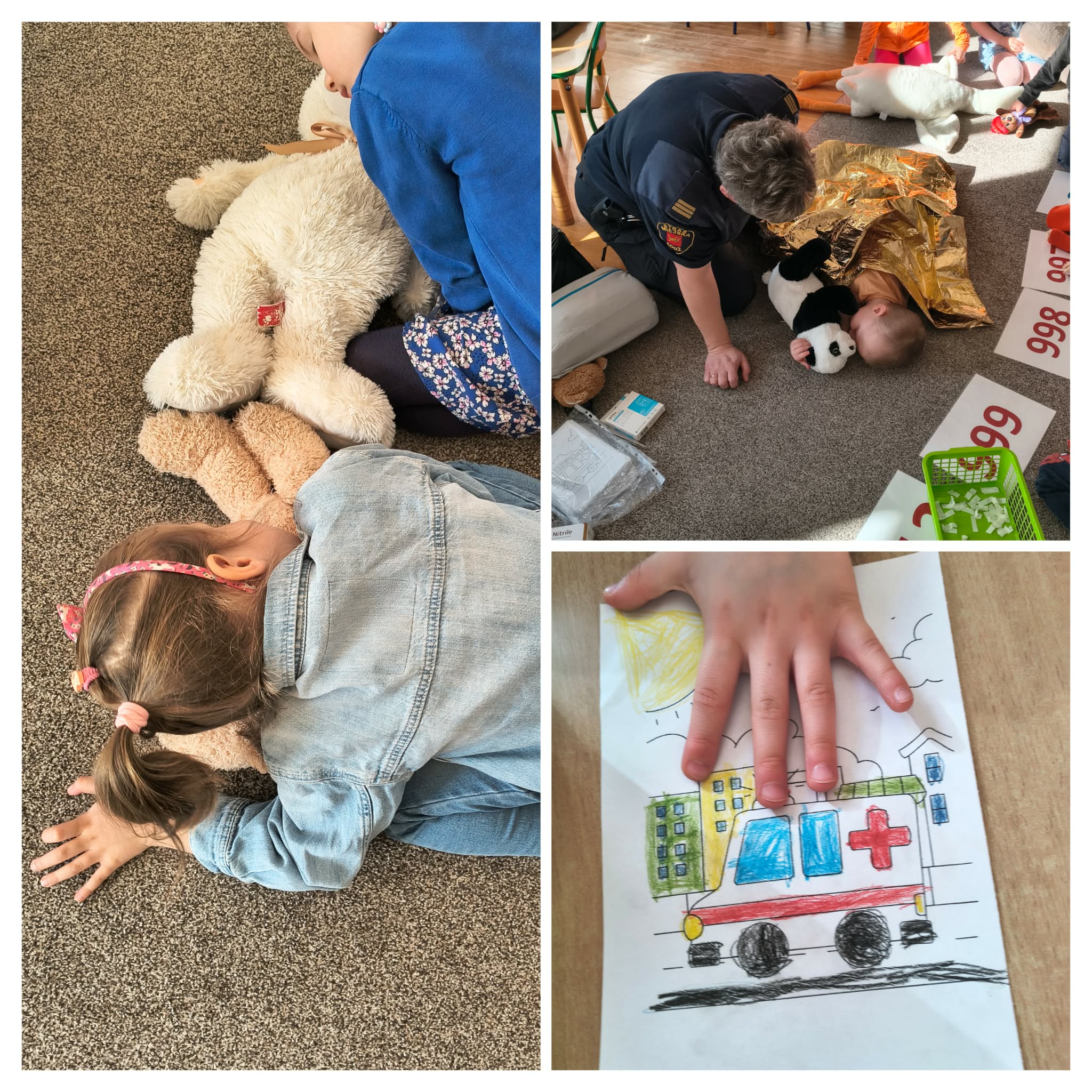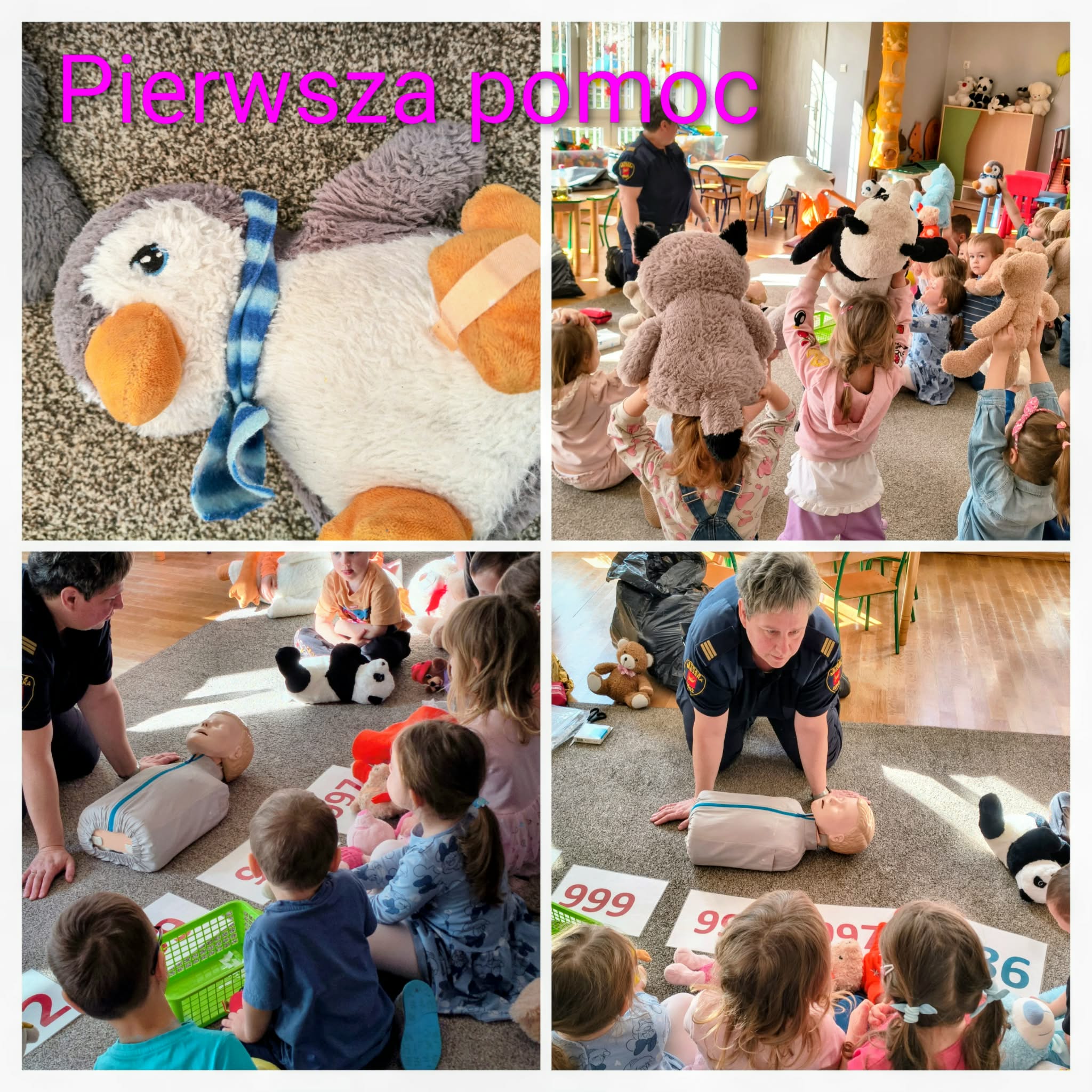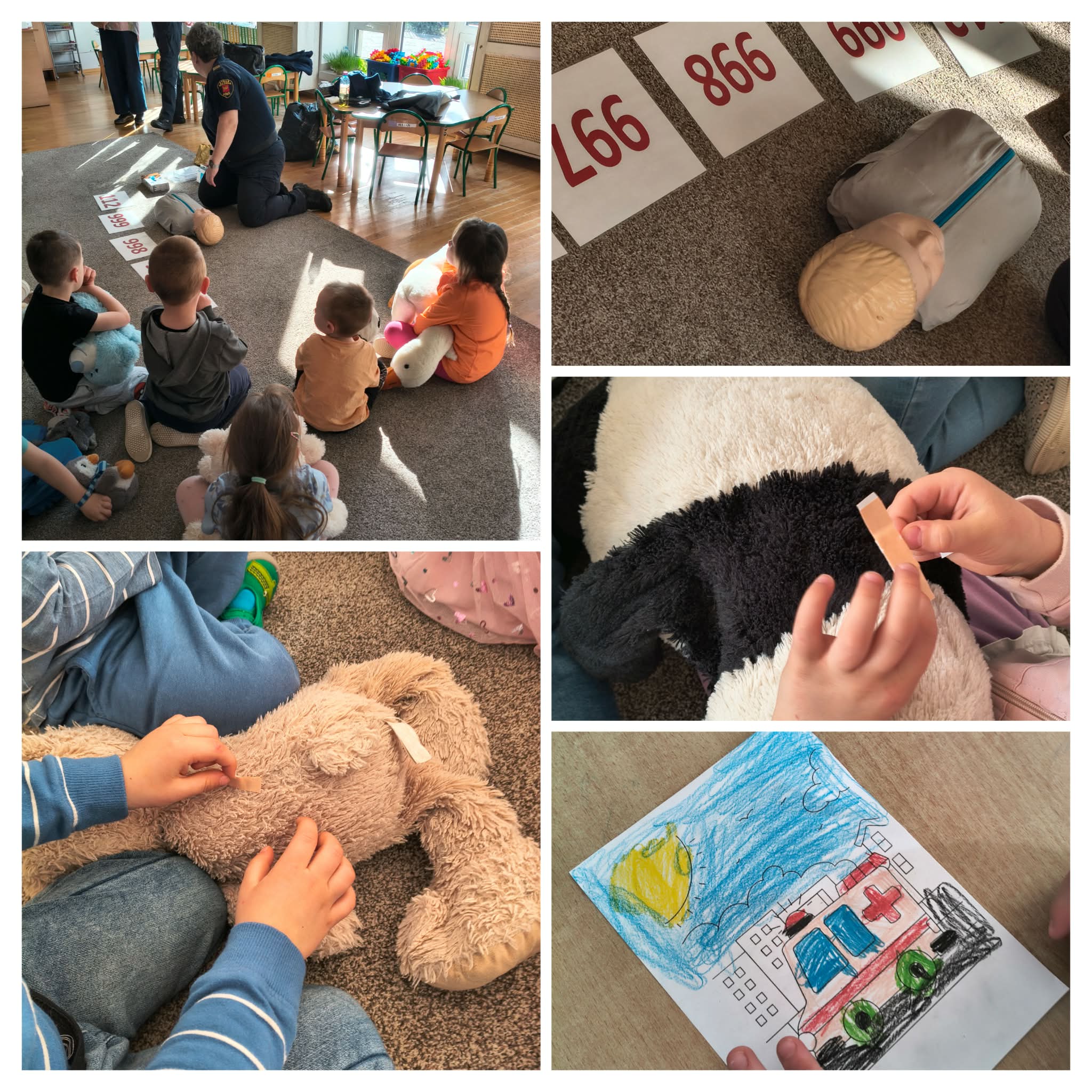 W naszym przedszkolu gościliśmy Straż Miejską, która przeprowadziła dla dzieci wyjątkowe zajęcia edukacyjne. Przedszkolaki miały okazję dowiedzieć się, jak udzielać pierwszej pomocy oraz jak zachować się w sytuacjach zagrożenia. Podczas zajęć dzieci ćwiczyły na swoich ulubionych misiach przyniesionych z domu, dzięki czemu nauka była nie tylko wartościowa, ale i bardzo angażująca. To było niezwykle ciekawe i ważne doświadczenie, które na długo pozostanie w ich pamięci.