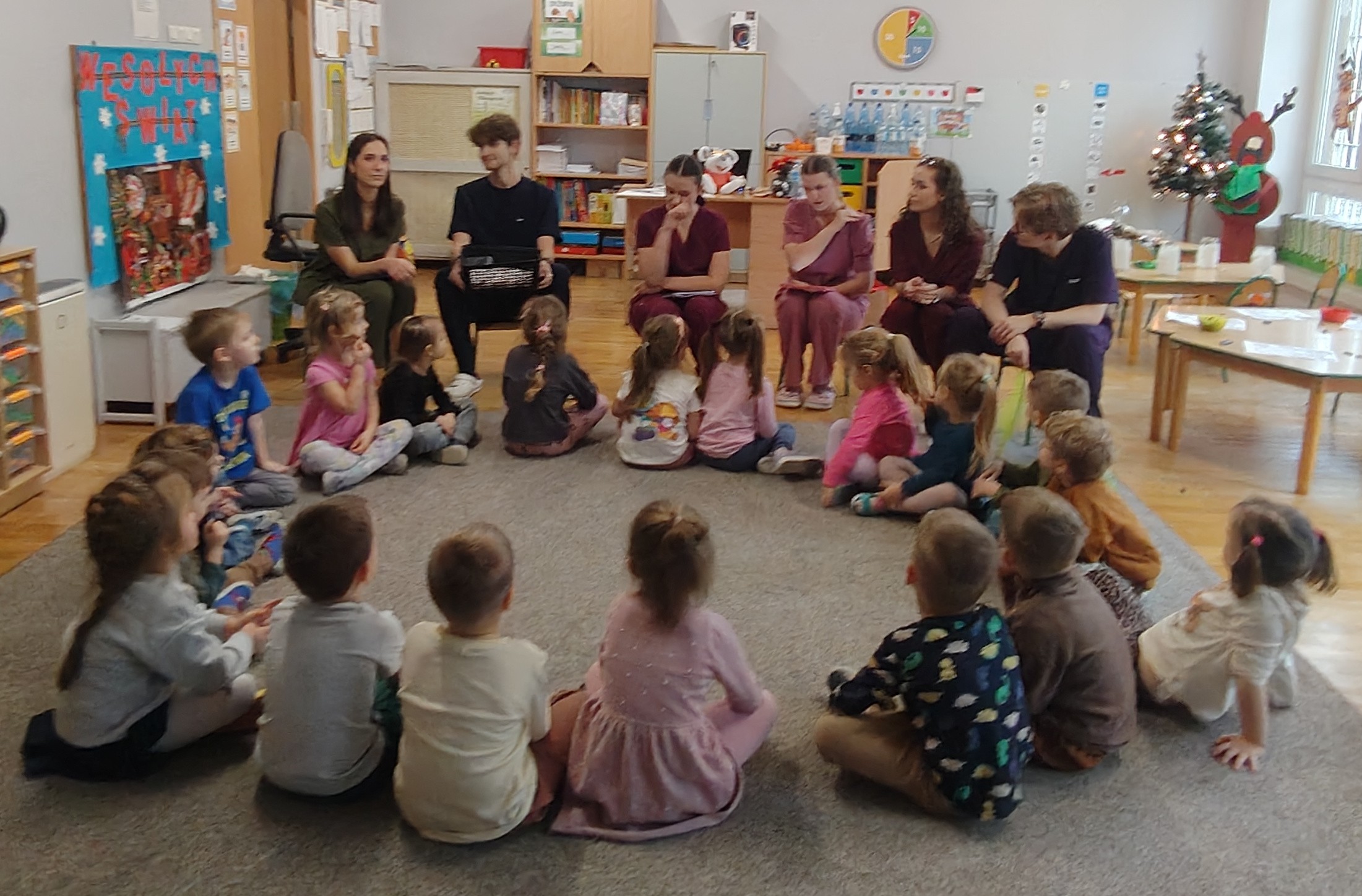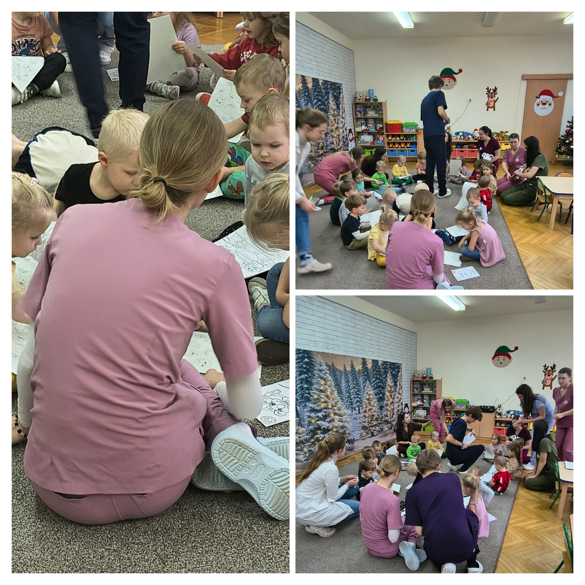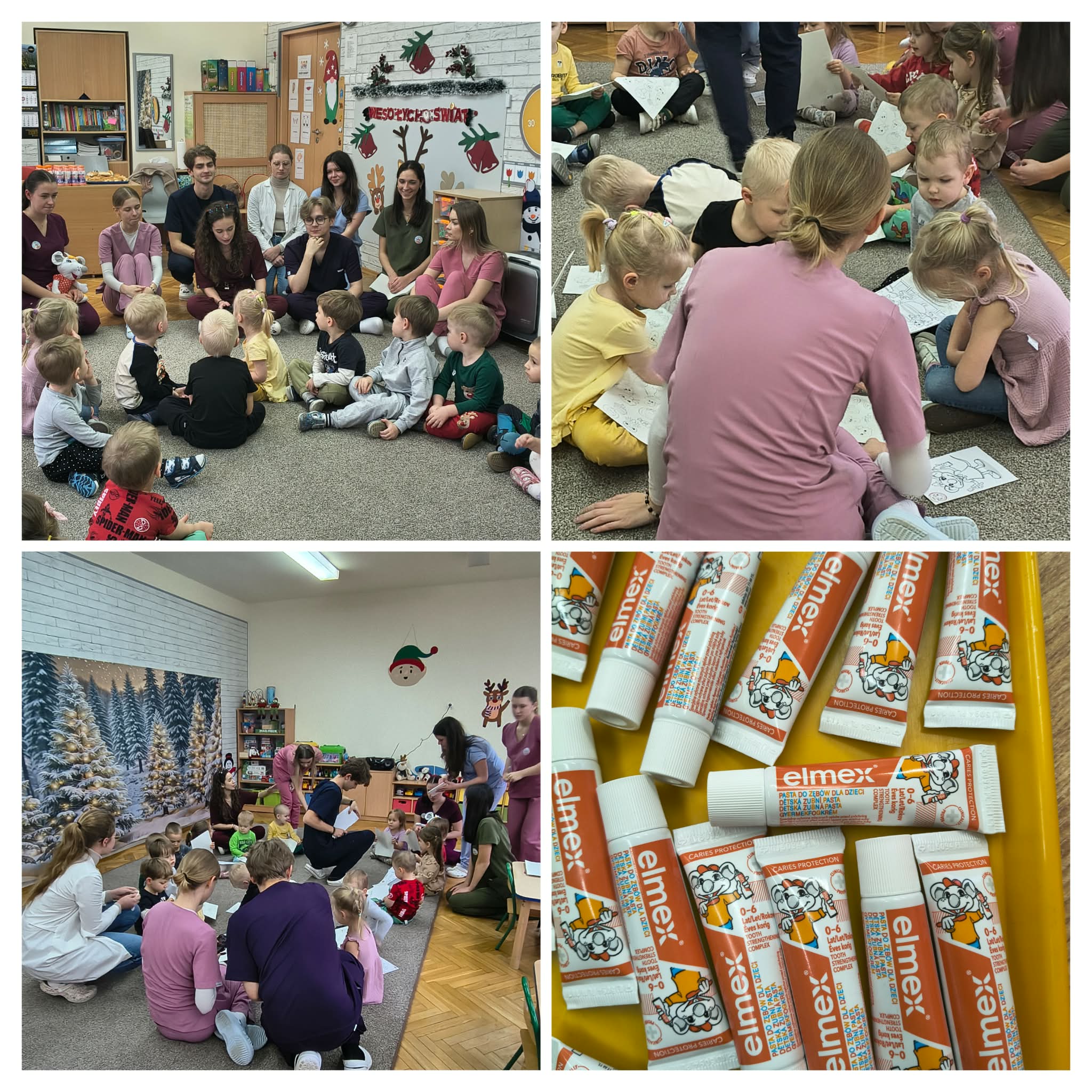 Dziś w naszym przedszkolu pojawili się studenci stomatologii dając naszym pociechom wskazówki do tego jak prawidłowo dbać o zęby. W przyjazny i ciekawy sposób opowiedzieli dzieciom o tym, jak dbać o zdrowy uśmiech. Przedszkolaki miały okazję dowiedzieć się, dlaczego regularne wizyty u dentysty są ważne oraz zadać wiele pytań młodym przyszłym lekarzom. Spotkanie przebiegało w miłej atmosferze. Dzieci wyszły z zajęć pełne entuzjazmu i nowych, cennych informacji o higienie jamy ustnej.