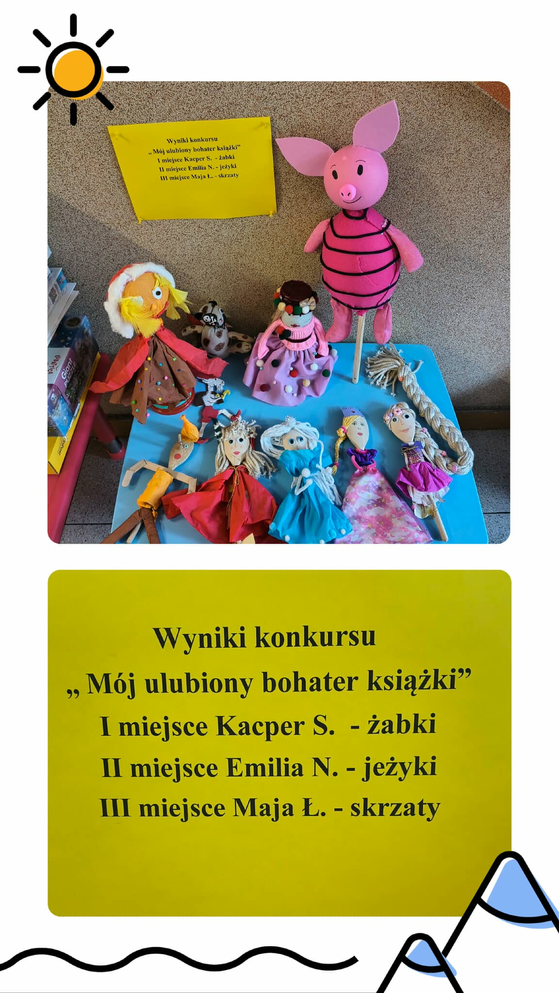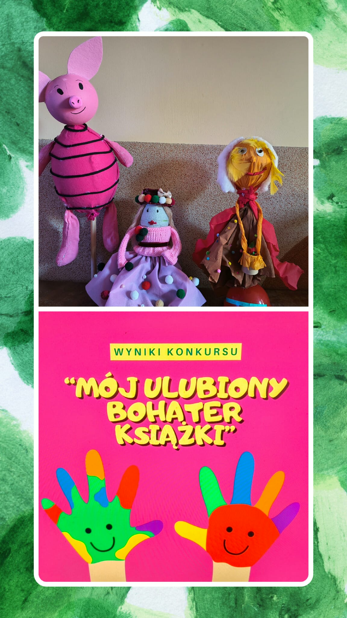 W dniu dzisiejszym rozstrzygnięty został wewnętrzny konkurs pt. "Mój ulubiony bohater literacki". W konkursie udział wzięły dzieci wraz z rodzicami a ich zadaniem było stworzenie pracy przestrzennej przedstawiającej swojego ulubionego bohatera literackiego.