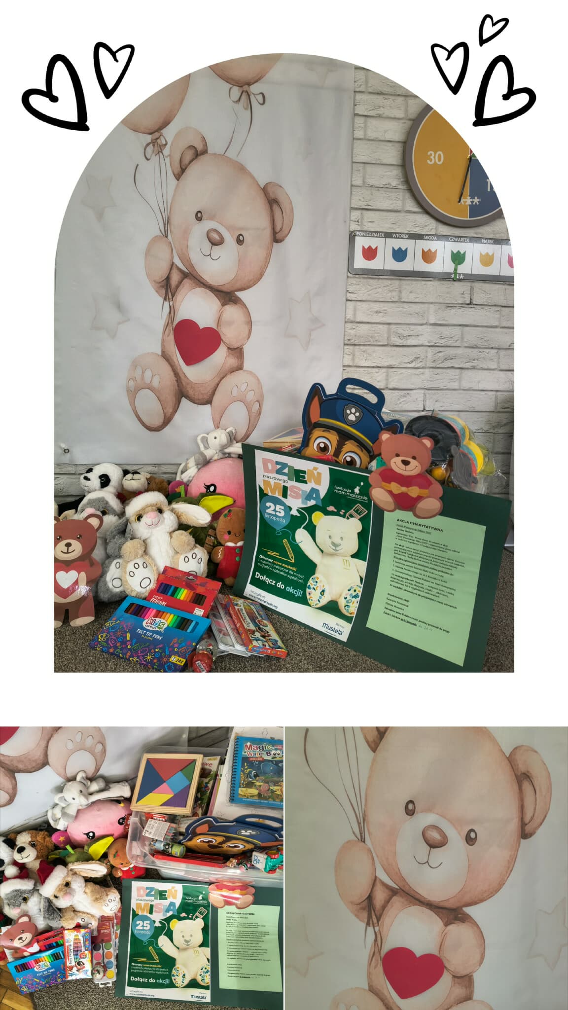 Serdecznie dziękujemy Rodzicom, za udział w akcji charytatywnej, organizowanej dzięki Fundacji "Mam Marzenie" z okazji Dnia Pluszowego Misia. Dzięki Waszej dobroci, zebraliśmy w naszym przedszkolu wiele zabawek, książek i artykułów papierniczych dla dzieci z łódzkich szpitali. Razem sprawiamy, że na ich twarzah pojawi sie więcej uśmiechu.